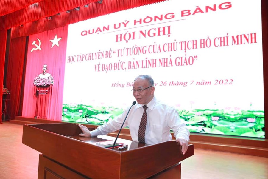 Thực hiện Chương trình công tác năm 2022, sáng ngày 26/7/2022 Quận uỷ Hồng Bàng tổ chức Hội nghị Báo cáo viên trực tuyến tháng 7 về học tập chuyên đề “Tư tưởng của Chủ tịch Hồ Chí Minh về đạo đức, bản lĩnh nhà giáo” do Giáo sư, Tiến sĩ Hoàng Chí Bảo - Nguyên uỷ viên Hội đồng lý luận Trung ương, chuyên gia cao cấp Học viện Chính trị Quốc gia Hồ Chí Minh thực hiện. Về làm việc với quận Hồng Bàng GS.TS Hoàng Chí Bảo đã tham quan phòng Đọc của quận, nghe các đồng chí lãnh đạo quận báo cáo tình hình. GS.TS Hoàng Chí Bảo đánh giá cao việc làm thiết thực, có ý nghĩa lớn trong việc góp phần chấn hưng văn hóa đọc đang có nguy cơ mai một đồng thời ghi nhận công tác giáo dục, bồi dưỡng chính trị tư tưởng cho cán bộ, đảng viên đặc biệt là việc triển khai tích cực, hiệu quả Chỉ thị 05 của Quận uỷ Hồng Bàng, chúc mừng những kết quả về tăng trưởng kinh tế, an sinh xã hội….mà quận Hồng Bàng đã đạt được.